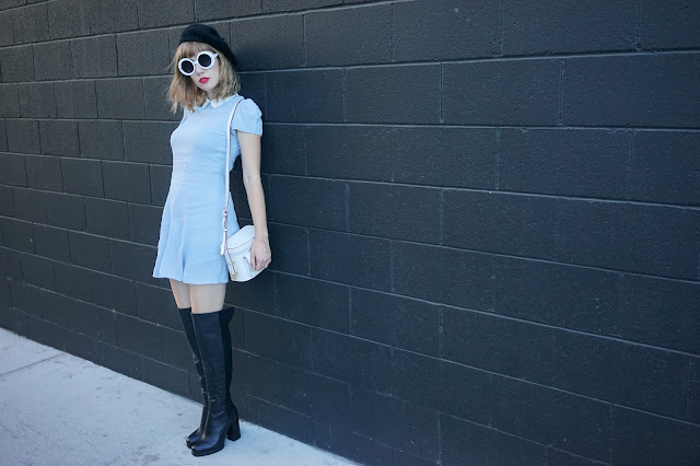 I absolutely love this dress by Reformation, I love the fit a lot. I feel like I look super small in all of their dresses because their fit is damn near perfect. This is a petite size 4, it fits me perfectly. I love the cap sleeves and collar. This dress reminds me of my designs for my own line called Royce Roiland. One day when I have more time on my hands I will actually go forward with my line. My beautiful amazing knee high boots are by Circus by Sam Edelman. I love how I paired these beautiful boots with my new 60s style collared dress and my adorable Rebecca Minkoff bag. I would love to meet Rebecca Minkoff soon, she's designed her stores to be technology based. She understands fashion and technology merging more and more and the importance of online shopping.